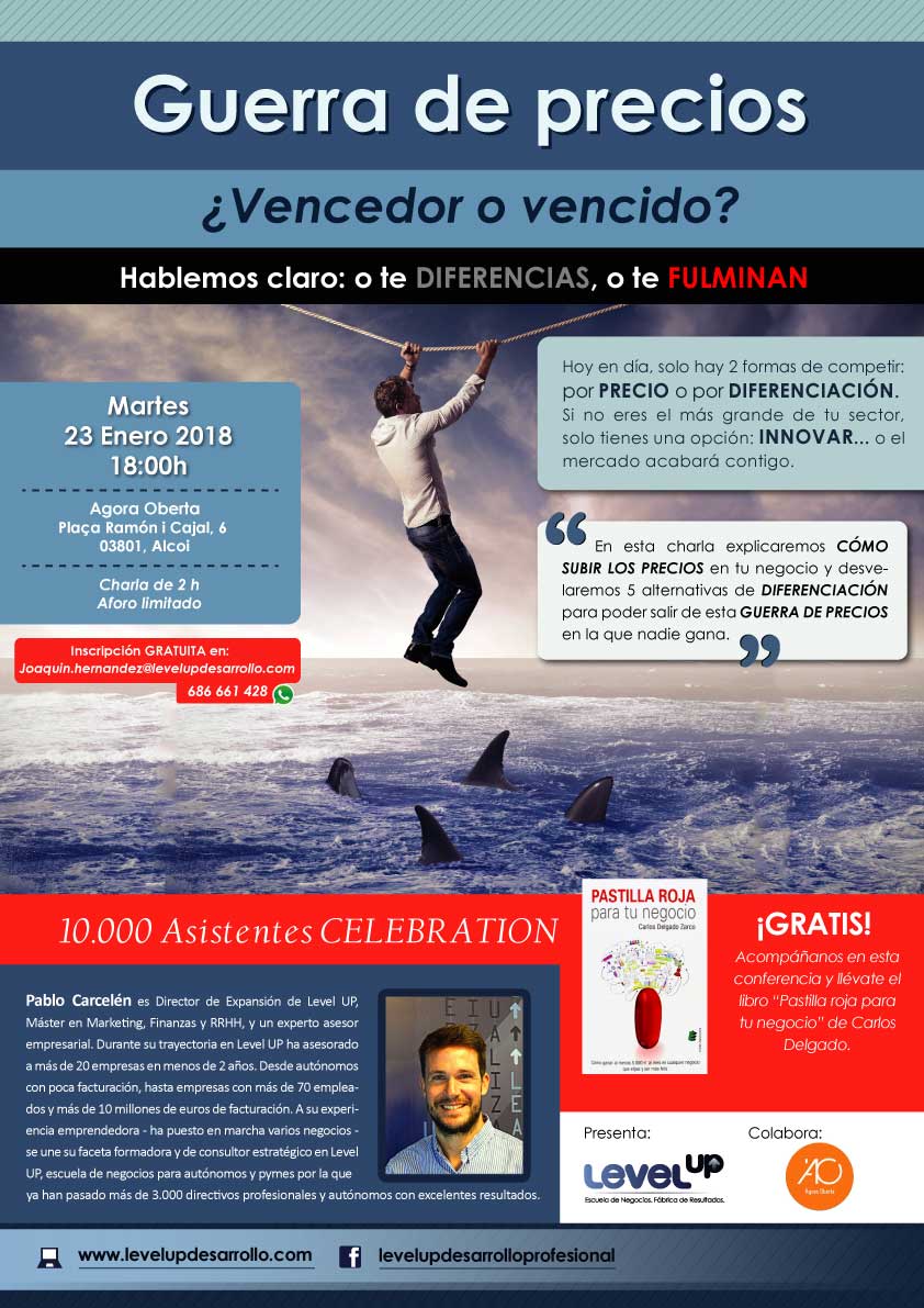 Admite, date cuenta de que eso sólo te lleva a cerrar tu negocio, porque tus beneficios solo hacen que bajar. En esta conferencia aprenderás a diferenciarte, en tu sector y negocio, y por tanto, a poder ¡cobrar más!