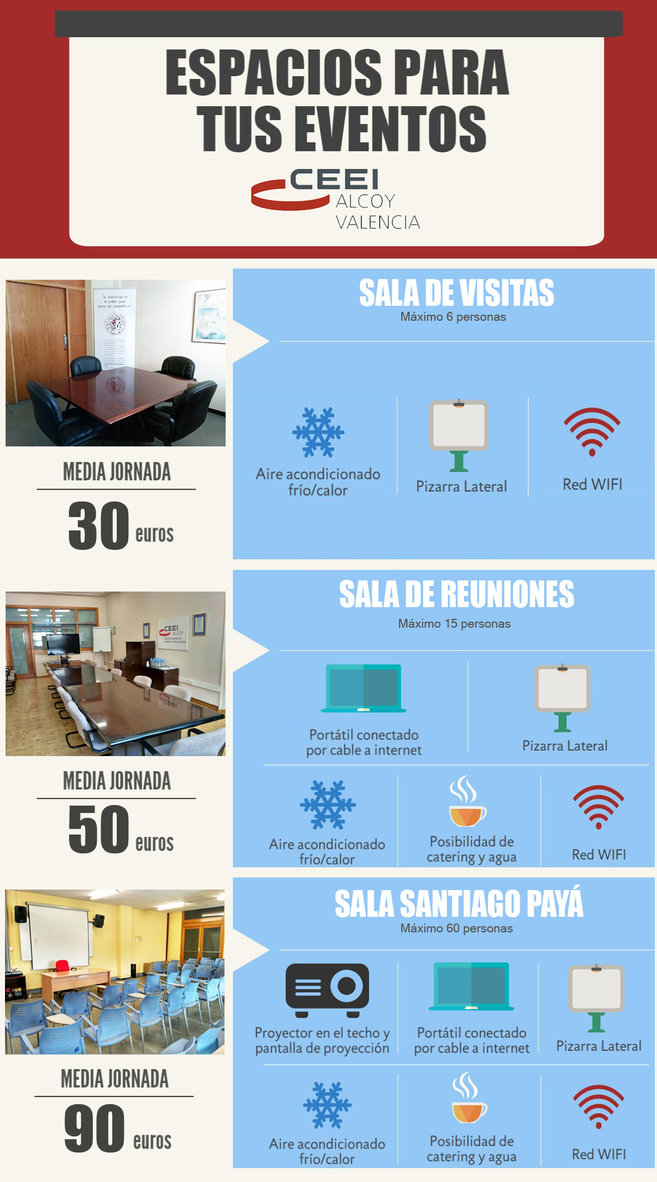 CEEI Alcoi además con un equipo profesional que te asesorará en la elección del espacio idóneo para el desarrollo de tu actividad: seminarios, congresos, presentaciones, reuniones de trabajo, cursos de formación, ruedas de prensa, etc.