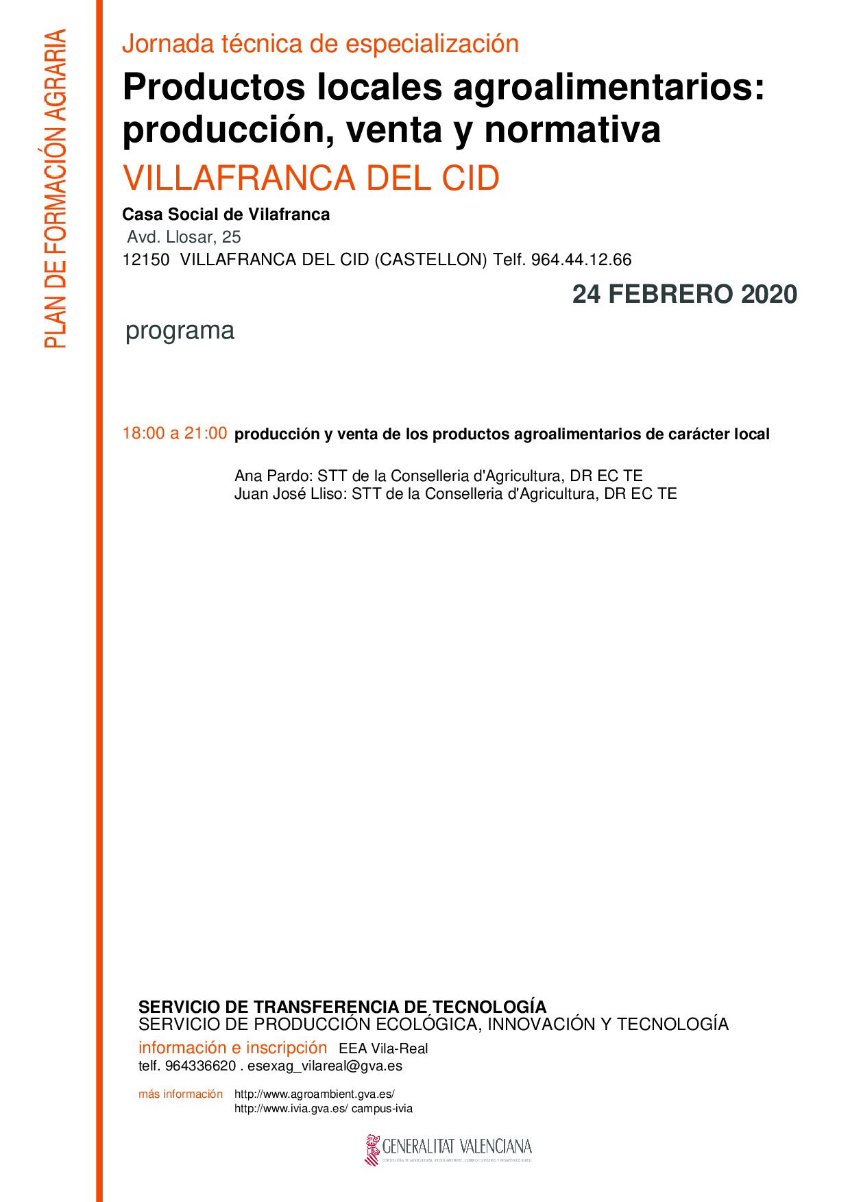 La Conselleria d'Agricultura, a través de la Estación Experimental Agraria de Vila-real, perteneciente al Servicio de Transferencia de Tecnología, y en colaboración con la Mancomunitat Comarcal Els Ports organiza esta Jornada sobre todo lo relacionado con la venta y producción de productos agroalimentarios de carácter local y de proximidad.