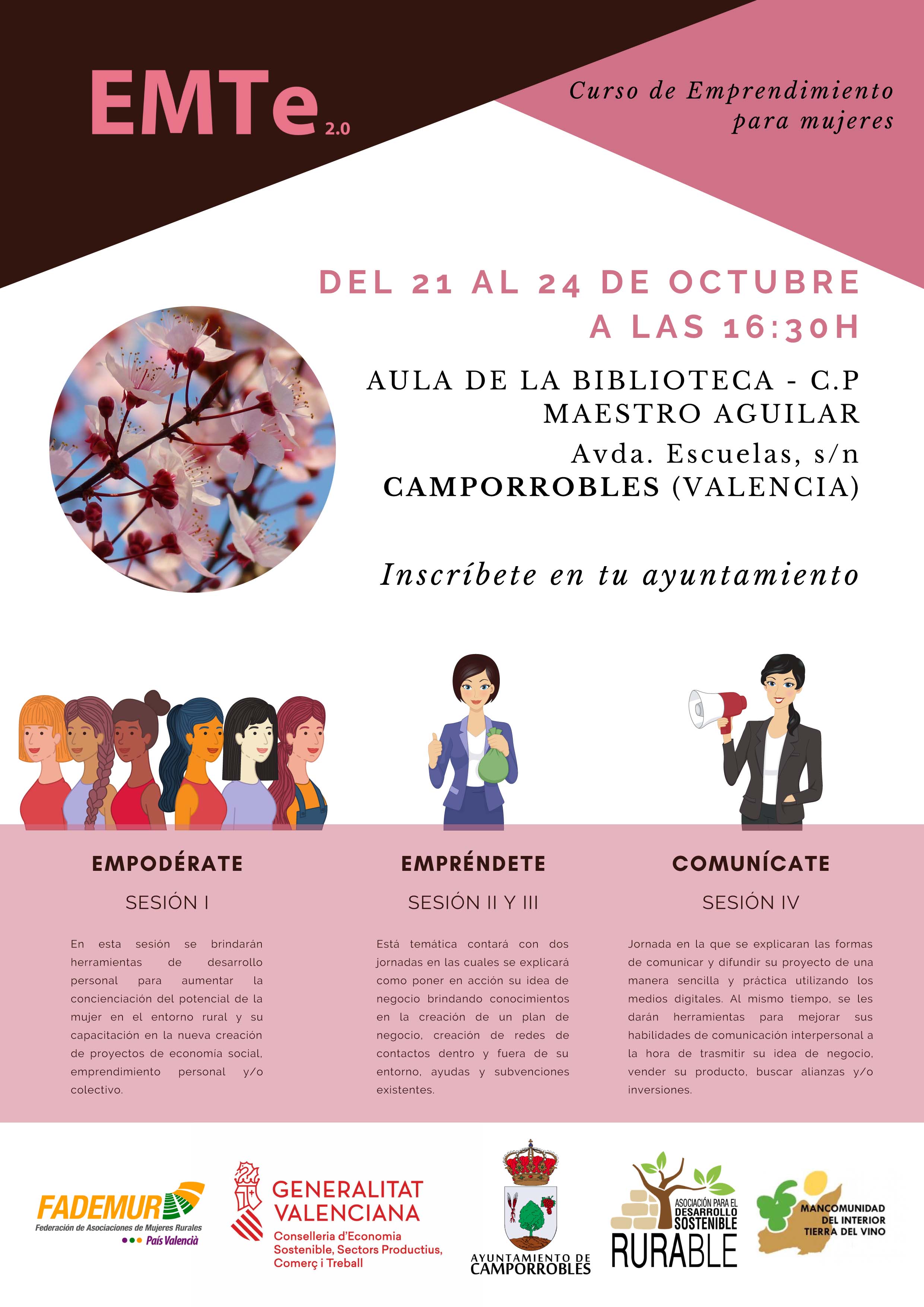 Empodérate”, “Empréndete” y “Comunícate” son los tres bloques que estructuran el curso “EMTE 2.0” sobre emprendimiento, de 4 días de duración y dirigido a mujeres de la comarca de Utiel-Requena.