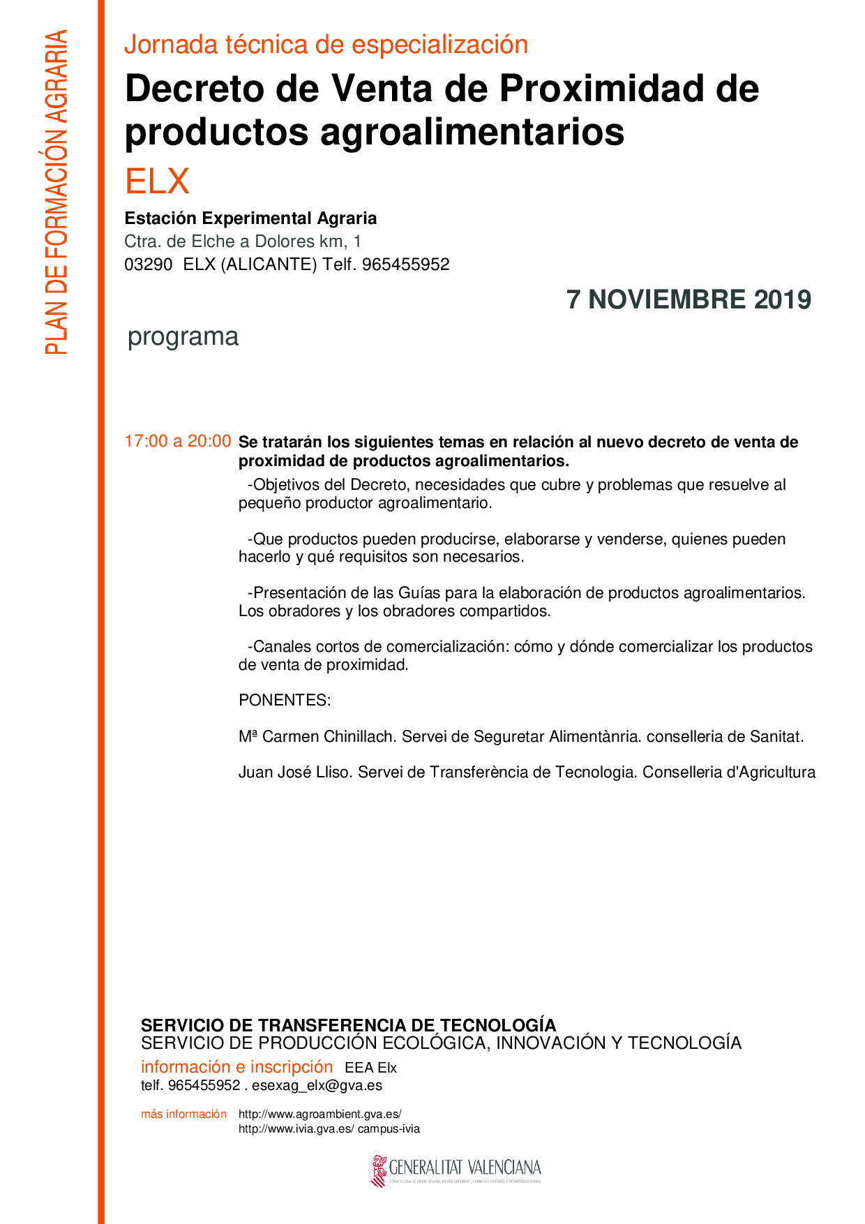La Conselleria d'Agricultura, a través de la Estación Experimental Agraria de Vila-real, perteneciente al Servicio de Transferencia de Tecnología, y en colaboración con la Estación Experimental Agraria de Elx organiza esta Jornada sobre el nuevo Decreto del Consell de Venta de Proximidad de productos primarios y agroalimentarios, contando para ello con la intervención de una de las redactoras de dicho Decreto, además de un técnico de la Conselleria de Agricultura especializado en comercialización.