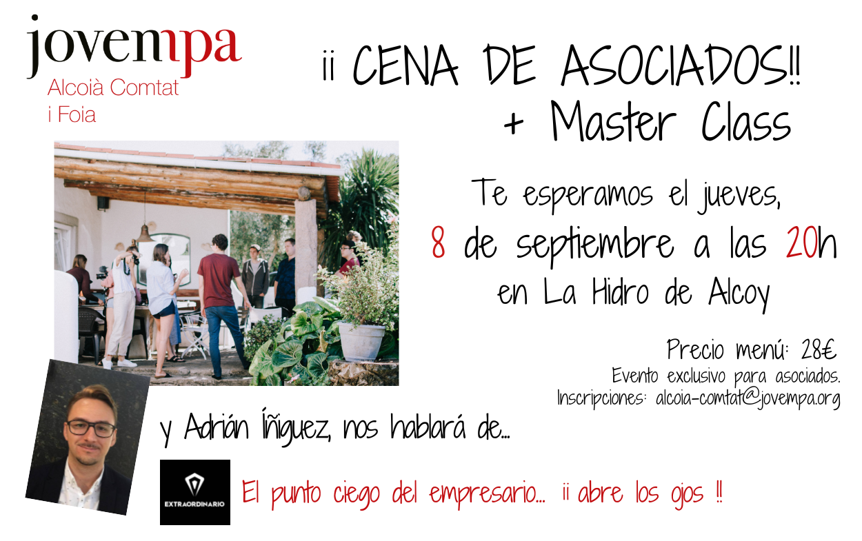 El jueves 8 de septiembre en el restaurante La Hidro de Alcoy tendremos una cena de asociados, tras la master class: El punto ciego del empresario ¡abre los ojos! con Adrián Ìñiguez de Extraordinario.