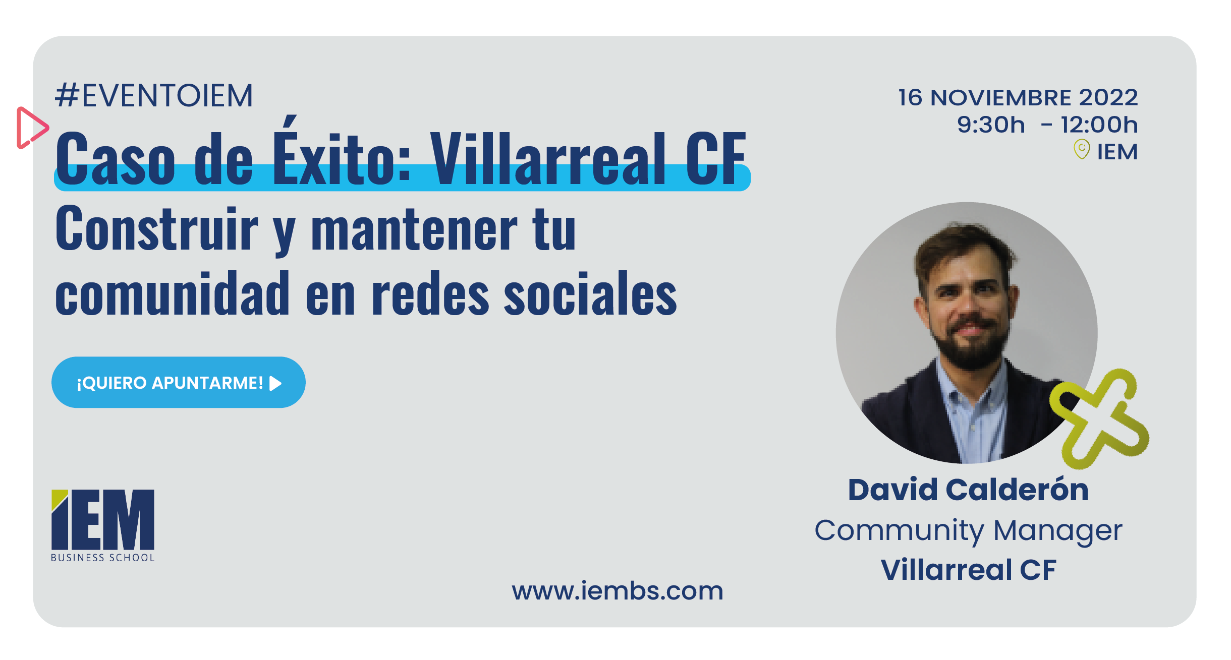En el próximo #EventoIEM, David Calderón, Community Manager en Departamento de Prensa en Villarreal CF, contará la evolución de las redes sociales del gran club así como las estrategias de crecimiento y de comunidad que han llevado a cabo para ser a día de hoy uno de los grandes clubes en redes sociales.