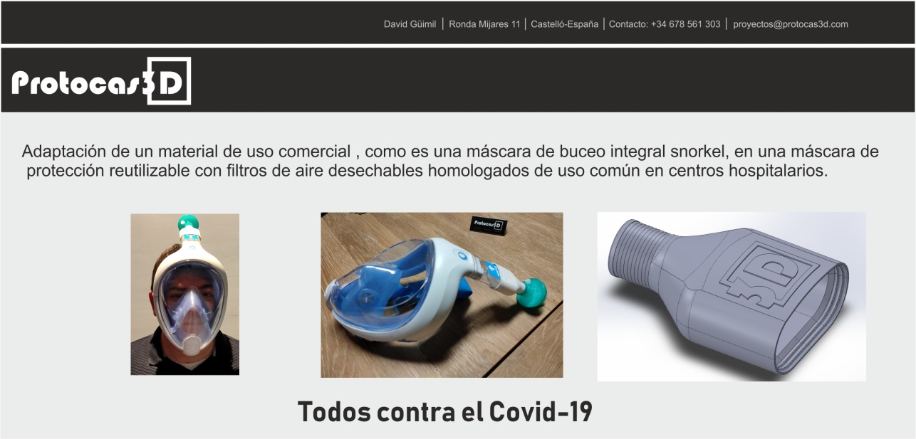 Con el objetivo de proporcionar la mejor protección posible a los profesionales de la Sanidad Pública que se enfrenta diariamente y en primera línea al COVID 19, la empresa de Castellón Protocas3D realiza unas adaptaciones de un material  ocio/deportivo haciendo que puedan utilizarse como EPIs y  como dispositivos CPAP.