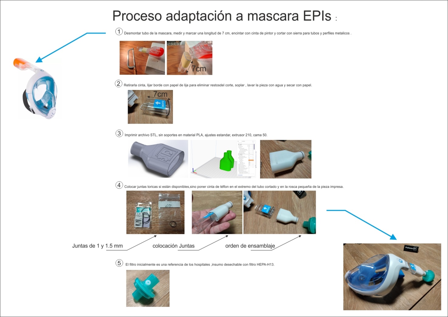 Este adaptador te permite con unos sencillos pasos (ver imagne de la derecha) hacer que estas máscaras puedan ayudar como EPIs y como CPAP.