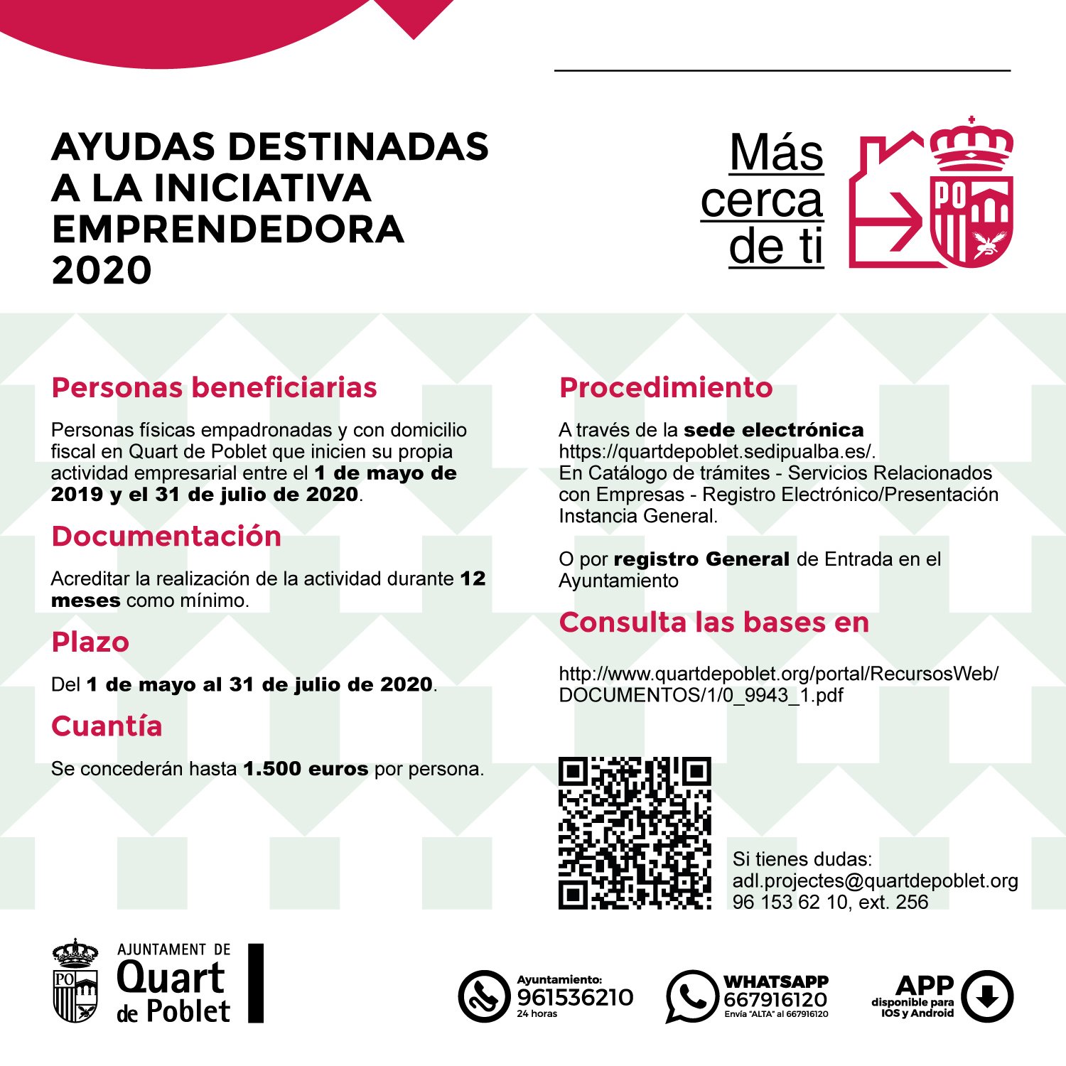 Personas físicas empadronadas y con domicilio fiscal en Quart de Poblet que inicien su propia actividad empresarial entre el 1 de mayo de 2019 y el 31 de julio de 2020.