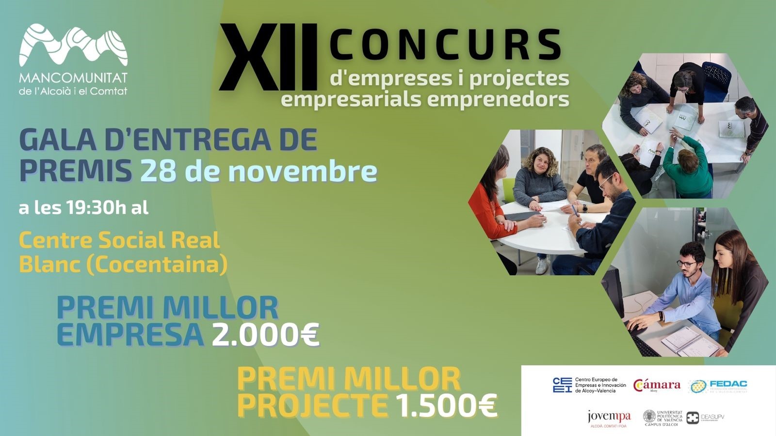 La Gala de entrega de los XII premios Concurso de Empresas y Proyectos Empresariales Emprendedores de la Mancomunitat de l’Alcoià i el Comtat tendrá lugar el próximo jueves, 28 de noviembre a las 19:30 horas en el Teatro Principal de Banyeres de Mariola.