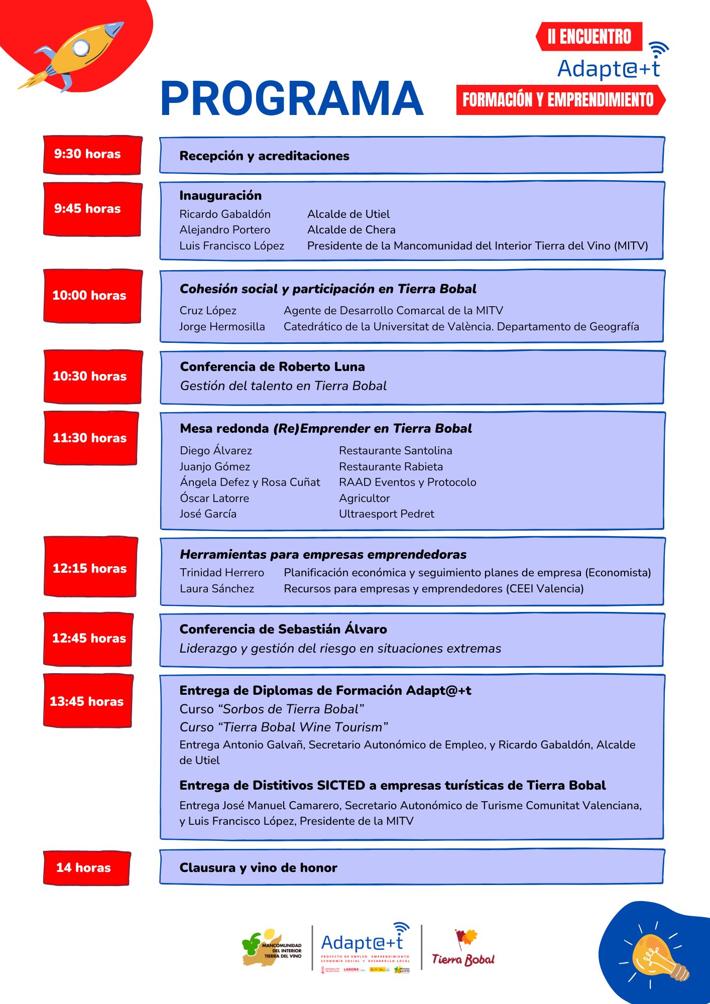 En el evento se abordarán cuestiones relaciones con el emprendimiento, la formación y la creación de empresas desde la perspectiva y el entorno que supone “re-inventarse” en tiempos de crisis. Por eso, esta edición contará con la participación de expertos como Sebastián Álvaro, creador del mítico programa “Al filo de lo imposible” emitido en La 2 de TVE, especializado en liderar equipos diversos y complejos en situaciones extremas, gestionando el riesgo en las peores condiciones climáticas. Además de Roberto Luna, experto en gestión del talento, que en su conferencia la “Gestión del talento en Tierra Bobal” se centrará en cómo aprovechar el potencial en organizaciones y personas, así como en la forma de sacar el máximo rendimiento como profesional y organización.