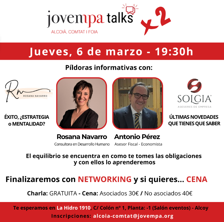 Jovempa Alcoià Comtat i Foia ha organizado un encuentro de asociados a dos bandas, Jovempa Talks x 2, con Antonio Pérez de Solgia y Rosana Navarro.