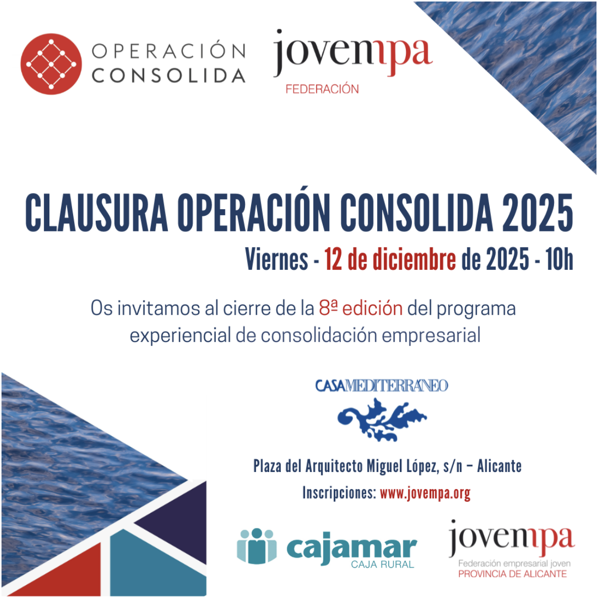 Clausura de la 8ª Edición de Operación Consolida 2025, que tendrá lugar el viernes, 12 de diciembre a las 10:00 horas en Casa Mediterráneo en Alicante.