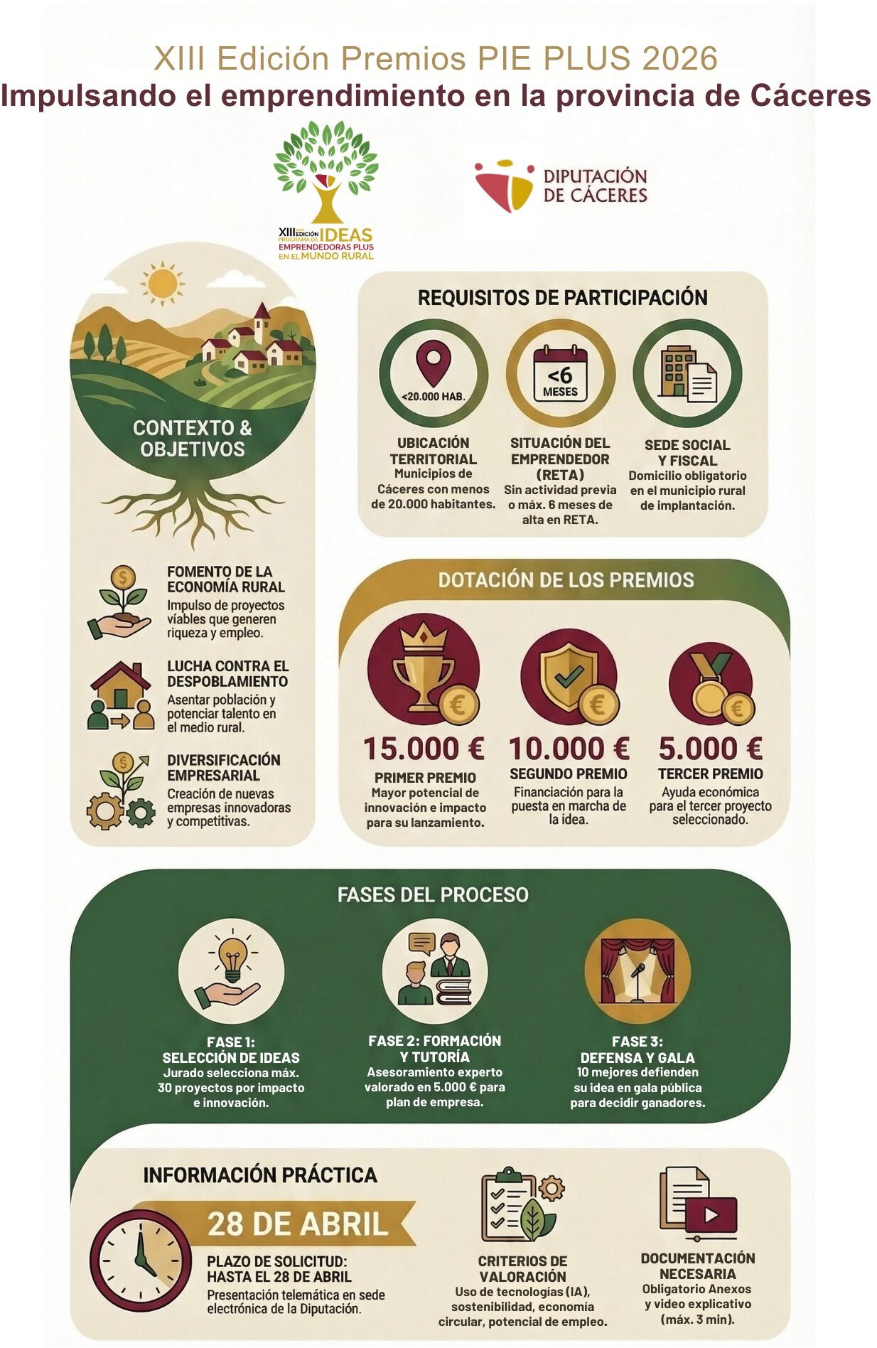 Con el fin de mejorar dicho Programa de Ideas Emprendedoras en el Mundo Rural, dentro del marco de las políticas de la Diputación Provincial de Cáceres contra el despoblamiento que sufre el medio rural cacereño, y teniendo como objetivos fomentar la implantación de nuevas iniciativas o el impulso de nuevas líneas de actividad, se renueva poniendo el foco en el esfuerzo de aquellas personas físicas que tengan ideas singulares sobre actividades económicas a desarrollar en los municipios de la provincia de Cáceres, y que se constituyan en nuevas altas como autónomos/as, contribuyendo a asentar población y atraer o retener el talento.