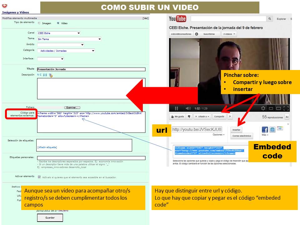 - Videos, que, para subirlos, de momento, se recomienda "cargarlos" en una plataforma social de videos, como Youtube, Vimeo, etc. para, luego, copiando y pegando el "código de incrustación" o "embeded code" de ese video en el correspondiente campo de la ficha previsto para tal fin, terminar cumplimentándola y cargando el video en emprenemjunts o en cualquiera de sus canales.