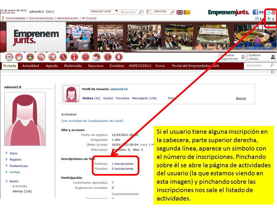 Si un usuario está inscrito en actividades, como se puede ver en la imagen, segunda de la derecha, en la parte derecha de la segunda línea de la cabecera, una vez iniciada sesión, se aprecia un símbolo con el número de inscripciones, y pinchando sobre ese símbolo se nos abre una página en la que aparece la actividad del usuario y concretamente las actividades en las que ha estado o está inscrito.
