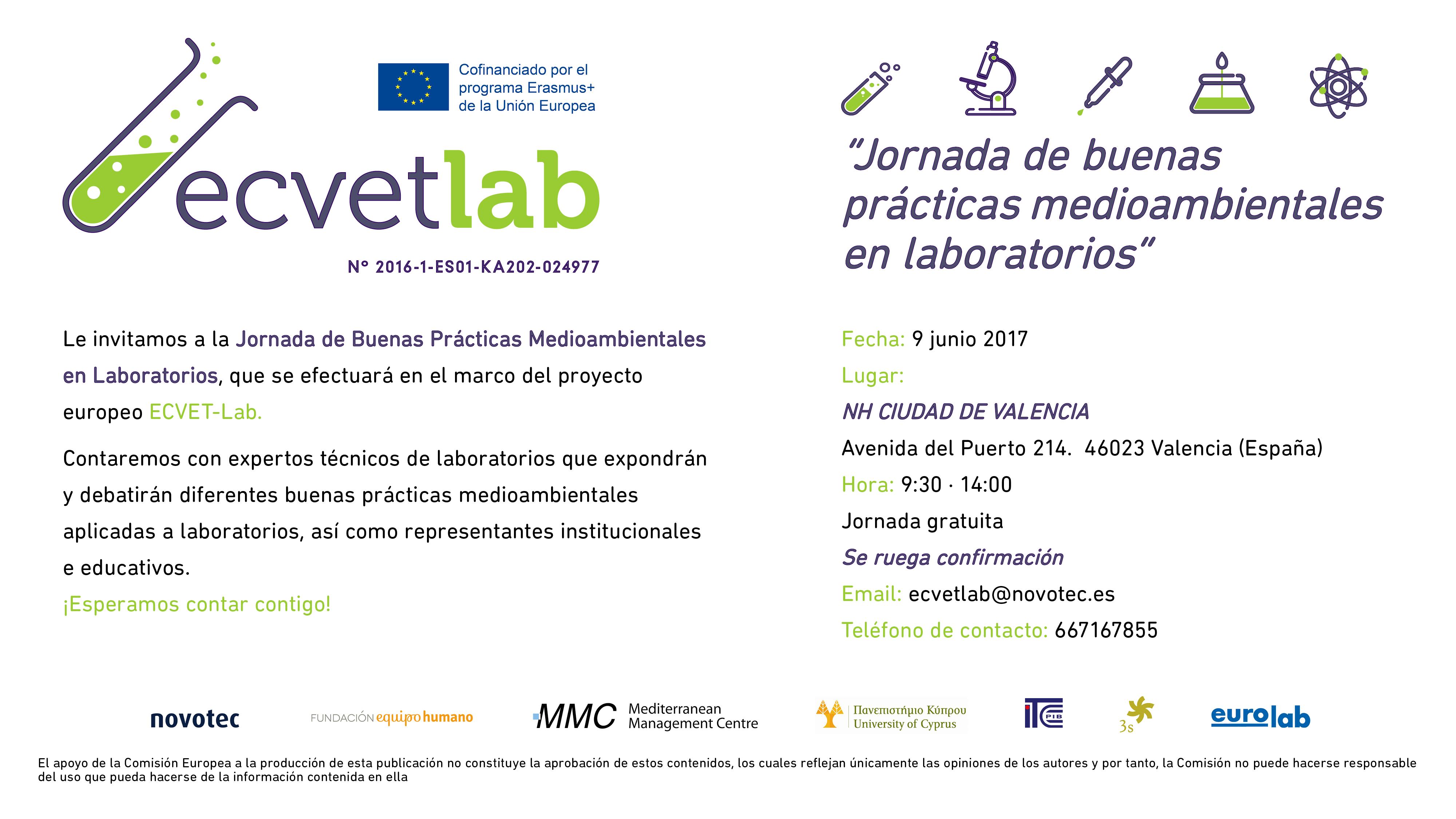 El próximo 9 de junio, tendrá lugar El focus group “Buenas prácticas medioambientales en laboratorios” en el hotel NH Ciudad de Valencia. Organizado por NOVOTEC Consultores, con el apoyo de la Fundación Equipo Humano, especializada en sostenibilidad y medio ambiente, ambas socios del proyecto europeo ECVET-Lab.