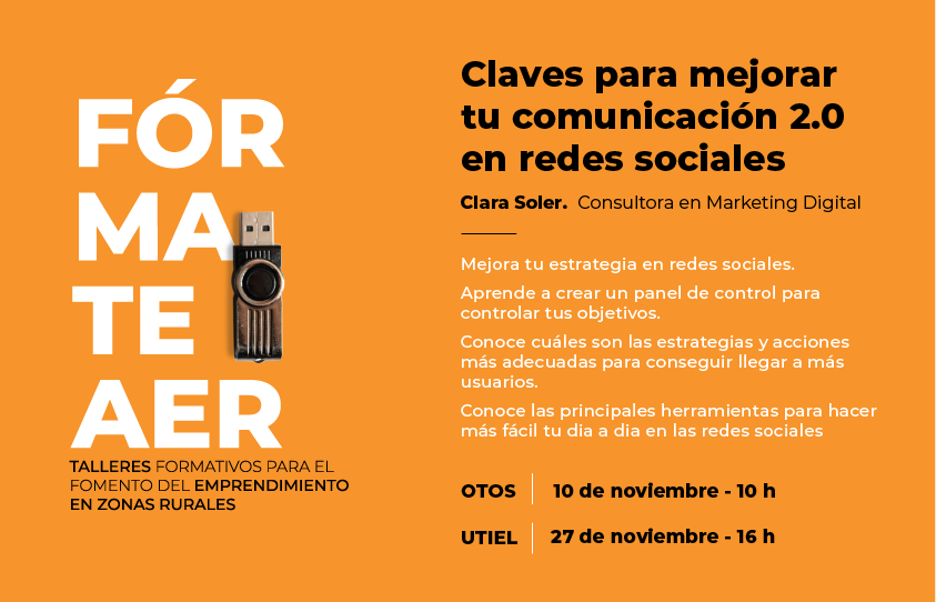 Continuamos con las acciones formativas de FormateAER, y en esta ocasión traemos un taller muy esperado por los emprendedores, el taller de Clara Soler para “Mejorar tu comunicación 2.0 en redes sociales”. Un taller dónde se expondrán y practicarán, todas aquellas acciones, programas, estrategias y planes a tener en cuenta para gestionar tu imagen 2.0, y para, al fin, conseguir llegar a más clientes.
