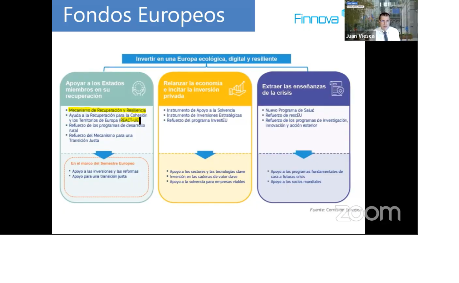 Con motivo de la jornada 'Fondos Europeos 2021-2027 para el desarrollo territorial'Juan Viesca, Director de Fondos Europeos de la Fundación Finnova ha dado a conocer hoy las oportunidades que ofrece Europa a los municipios gracias al plan de recuperación propuesto por la Comisión Europea para paliar los efectos del coronavirus.