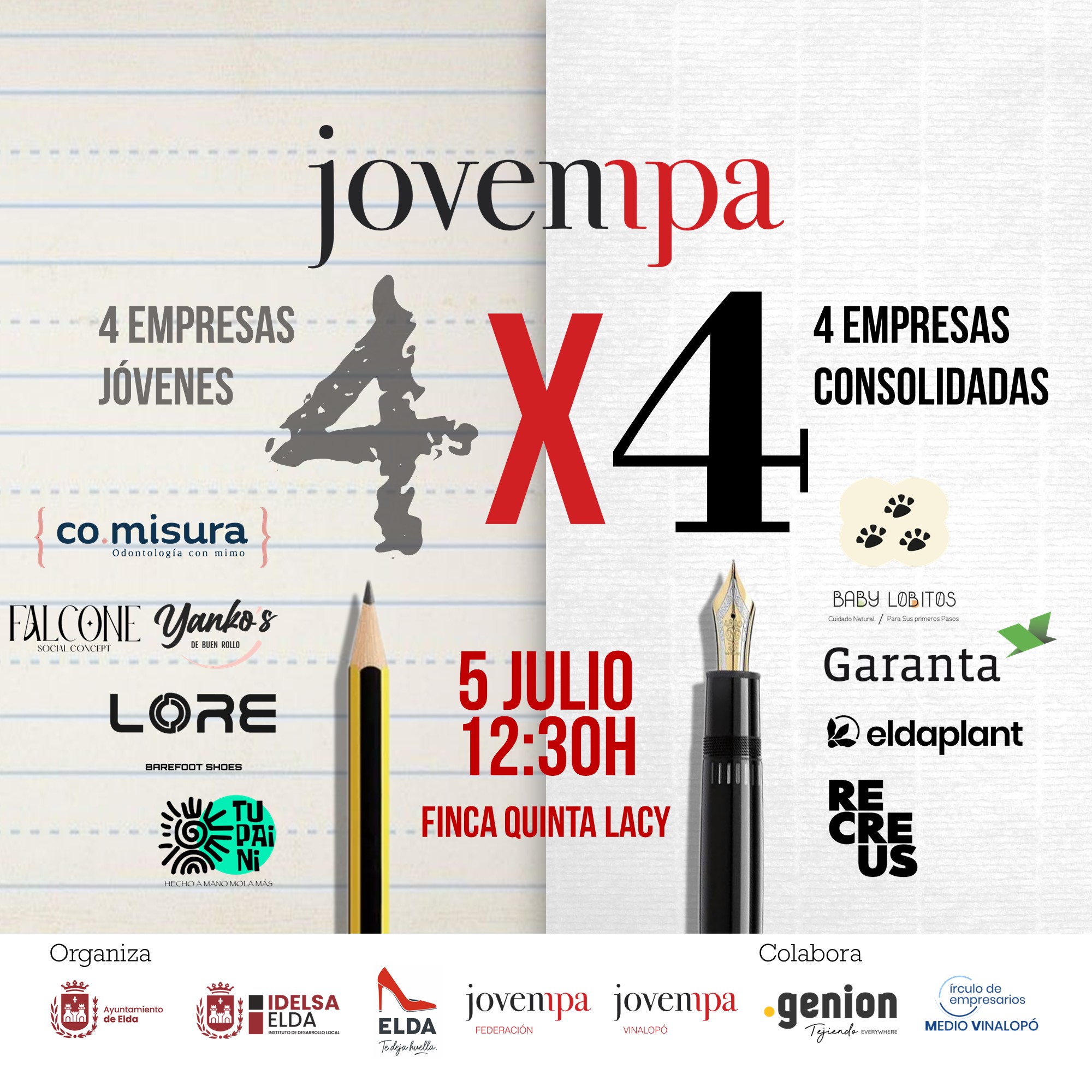 Jovempa 4×4 es un punto de encuentro para compartir experiencias y talento entre 4 empresas consolidadas y 4 empresas jóvenes de la comarca. En el evento se presentarán las 8 empresas protagonistas de esta edición, entrevistas en directo y se servirá un cóctel al finalizar el acto.