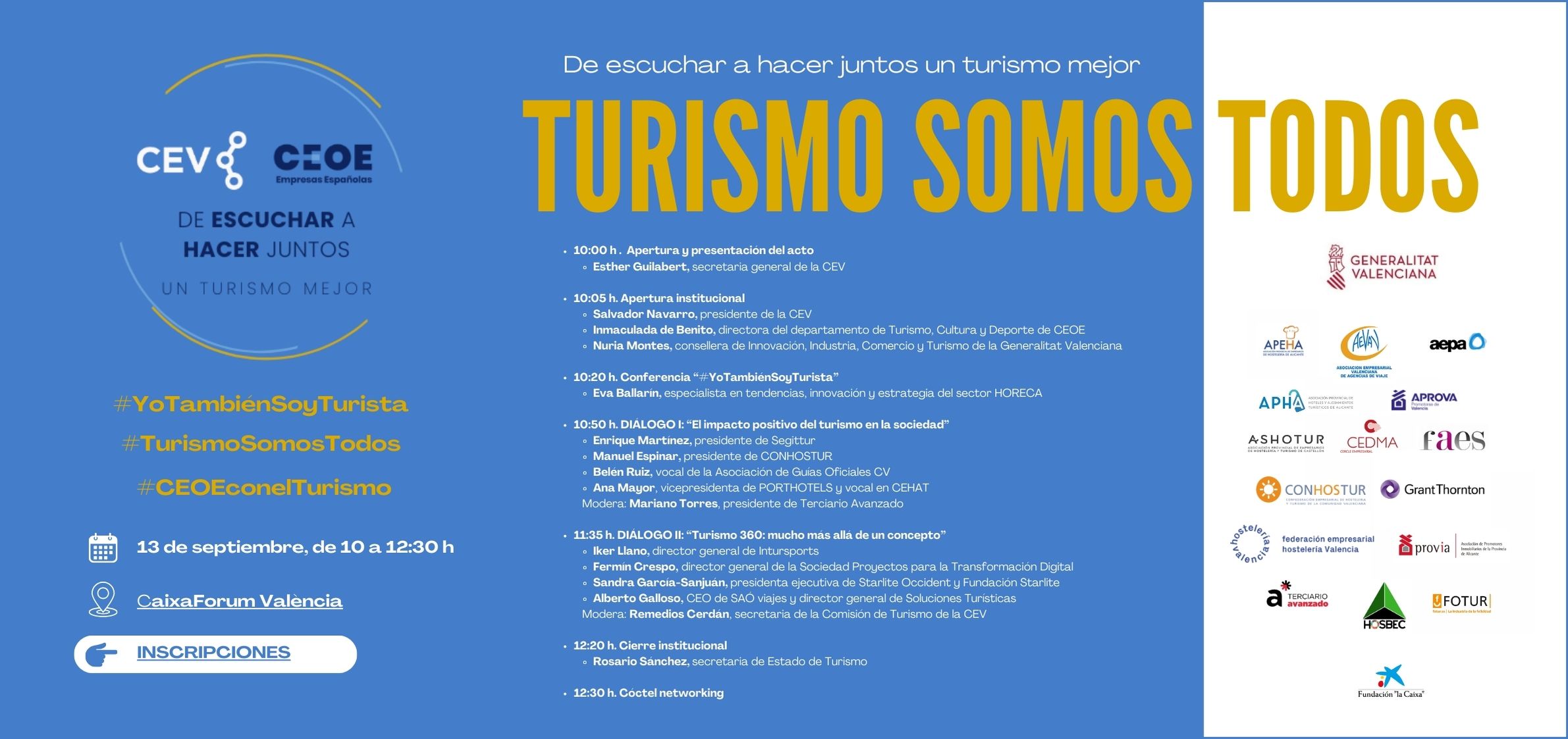 La Confederación Empresarial de la Comunitat Valenciana (CEV) y la Confederación Española de Organizaciones Empresariales (CEOE) celebrarán el próximo viernes 13 de septiembre a las 10:00 horas la jornada “Turismo Somos Todos. De escuchar a hacer juntos un turismo mejor” en CaixaForum València, con la finalidad de reunir a todos los actores empresariales para trabajar conjuntamente en la mejora continua del turismo, destacando la importancia de la escucha activa y la colaboración para lograr un impacto positivo y duradero.