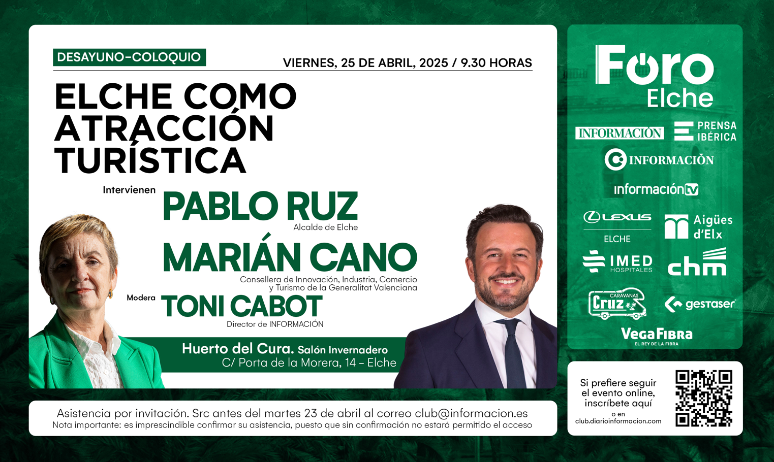 El alcalde de Elche, Pablo Ruz, y la consellera de Innovación, Industria, Comercio y Turismo de la Generalitat Valenciana, Marián Cano, serán los protagonistas el próximo viernes, 25 de abril, a partir de las 9.30 horas, de una nueva edición del Foro Elche
