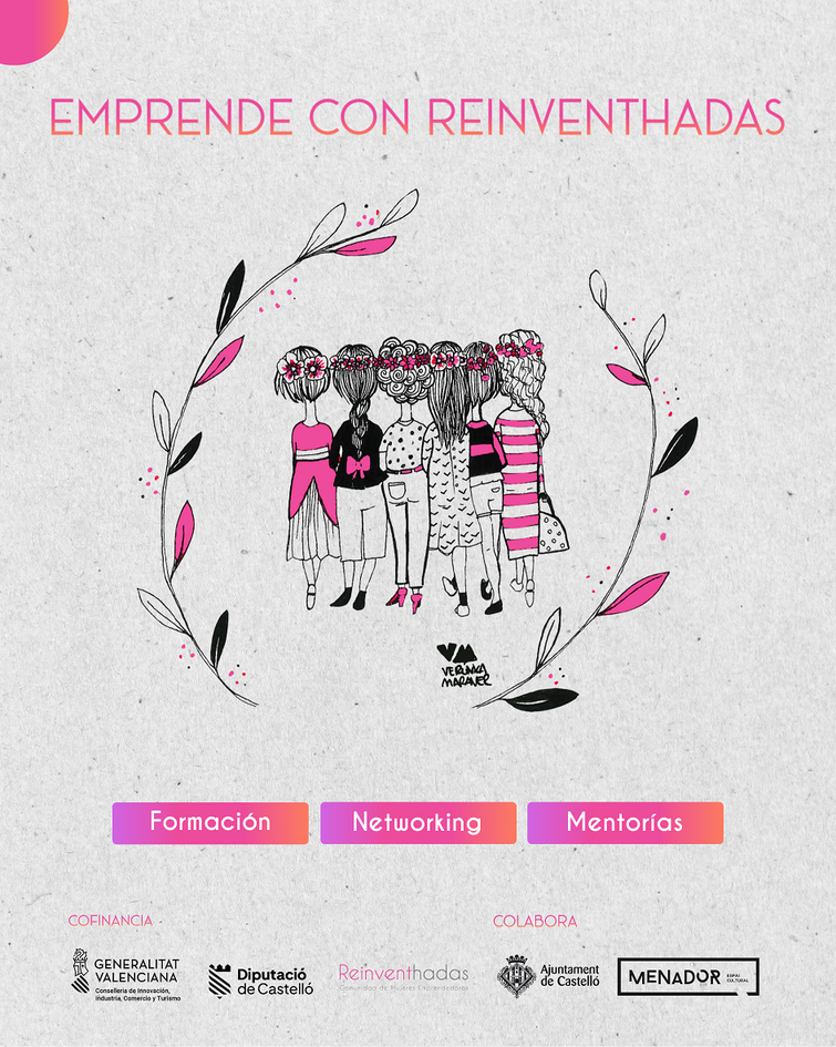 Este proyecto está cofinanciado por la Conselleria de Innovación, Industria, Comercio y Turismo, a través de la Dirección General de Emprendimiento e Internacionalización, en el marco de la Convocatoria EMENTI 2025, por la Diputación de Castellón, a través de las ayudas de Igualdad 2025 y por Reinventhadas. También contamos con la colaboración del Ayuntamiento de Castellón.