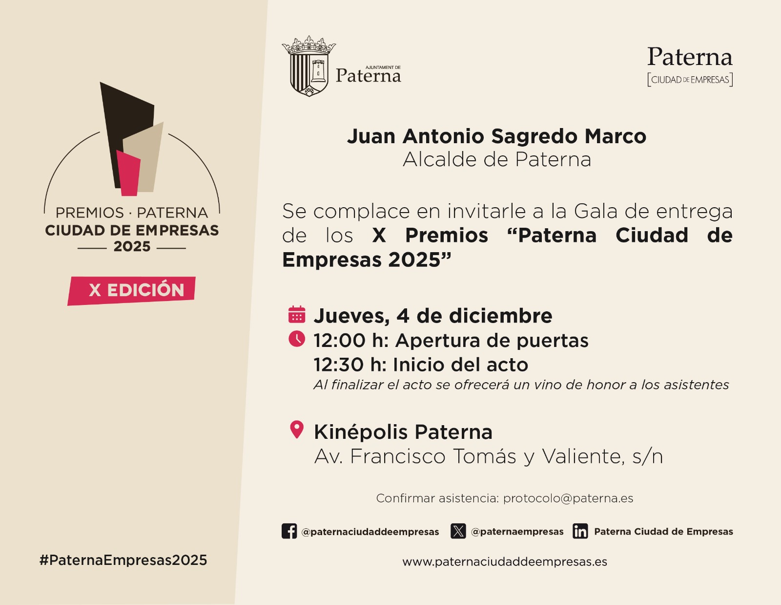 La asociación Paterna, Ciudad de Empresas convoca su X edición de sus premios, con los que celebra y promueve el reconocimiento de la labor de los/as empresarios/as y de las empresas de Paterna que contribuyen a la generación de riqueza y empleo en el municipio.