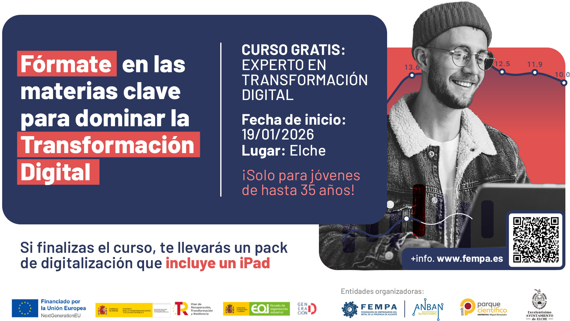 Toda la información está disponible en www.fempa.es/cursos/digitalizacion/experto-en-transformacion-digital-agentes-del-cambio-46. Aquellas personas que finalicen el curso, se llevarán un pack de digitalización: este incluye un iPad que servirá como herramienta para implantar todos los conocimientos adquiridos en el curso.